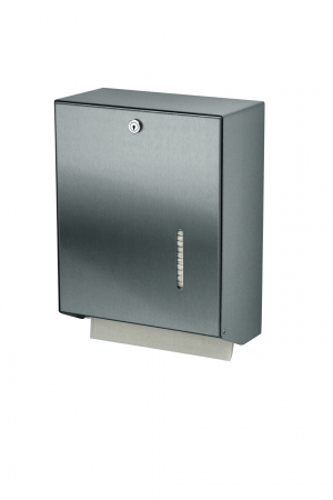 Deze robuuste handdoekverdeler van geborsteld inox kan wel tegen een stootje. De stevige cover biedt ruimte voor 400 – 900 handdoekjes. Hiermee bent u altijd verzekerd van een flinke voorraad. De dispenser wordt op vier punten aan de muur bevestigd. Deze solide constructie is volledig vandaalbestendig.